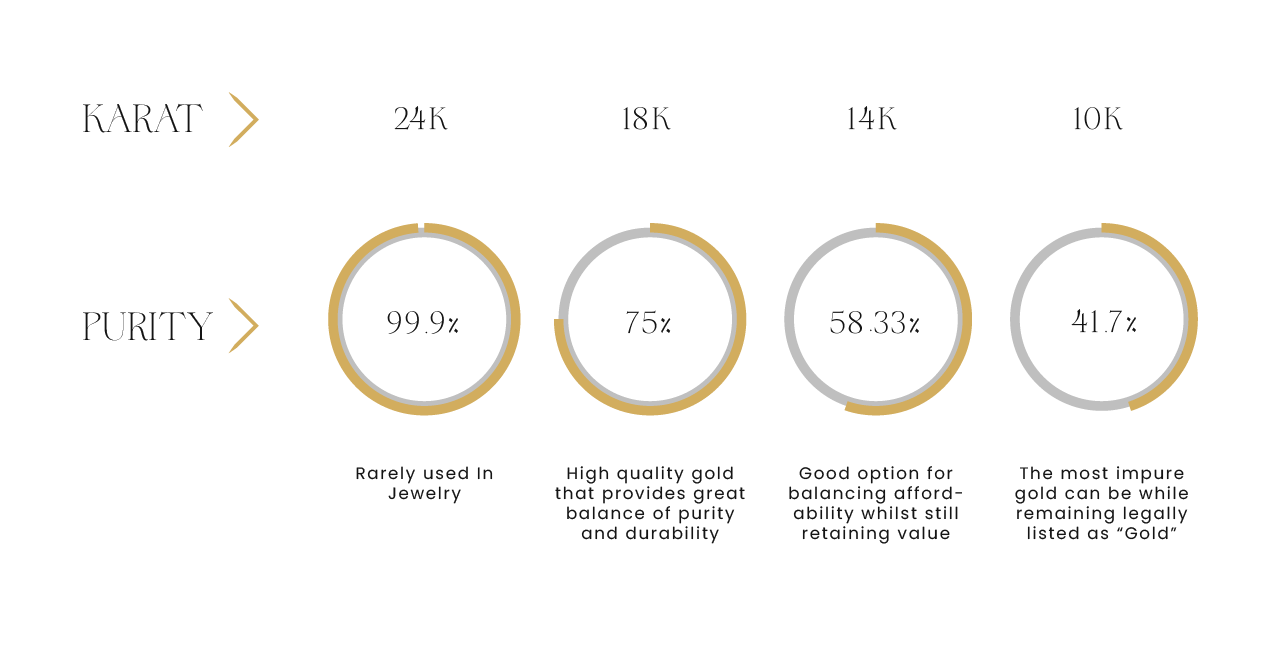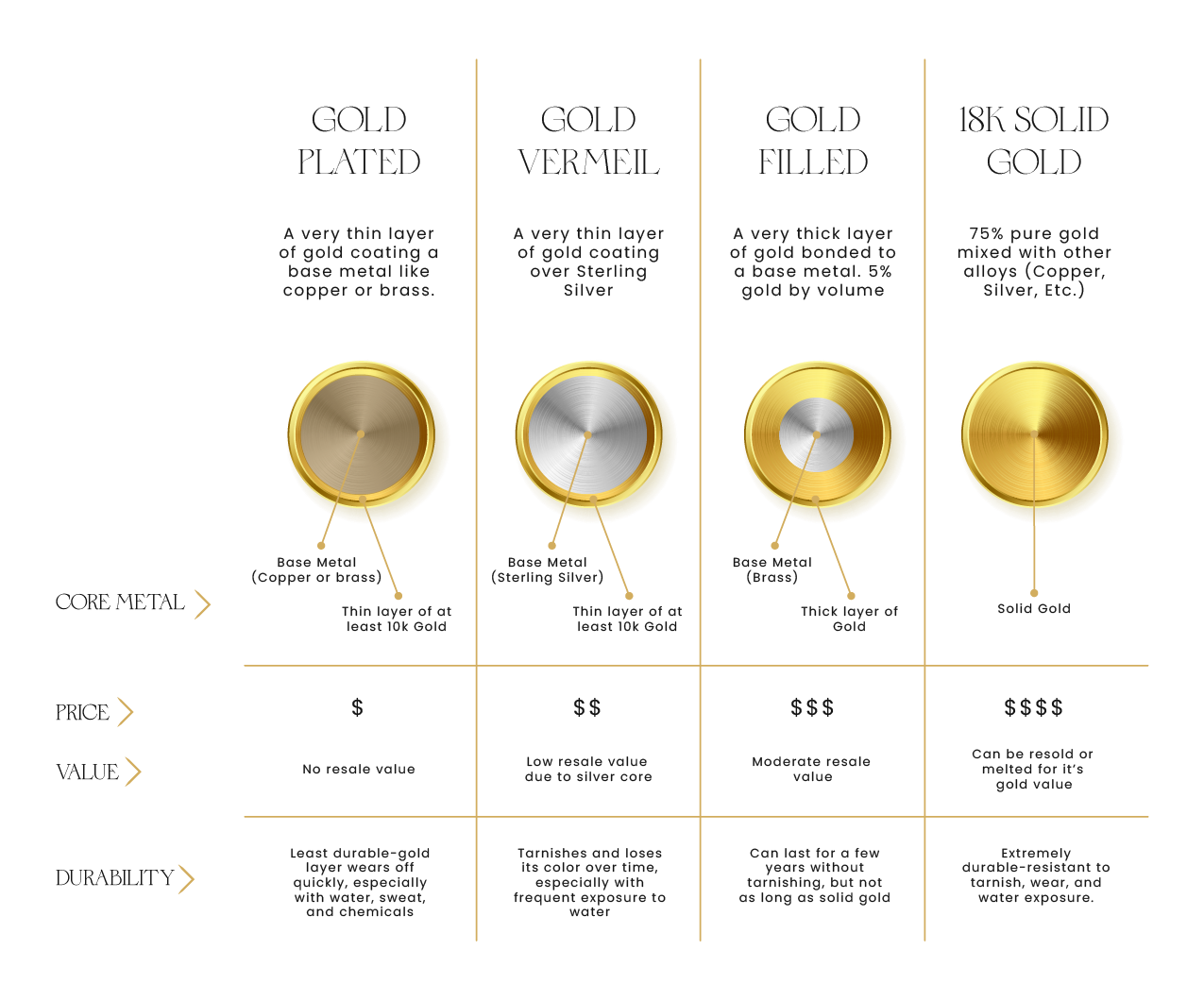 Plated, filled, or vermeil jewelry may look similar at first, but their value drops quickly because less than 5% of the piece is actually gold. Solid gold, by contrast, holds real, lasting worth. It can be resized, repaired, repurposed, resold, and passed down without compromising its integrity.